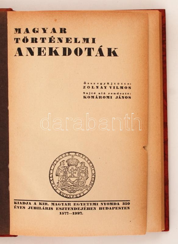 Magyar történelmi anekdoták. Összeáll.: Zolnay Vilmos. S. a. r.: Komáromi János. Bp., 1927, Királyi Magyar Egyetemi Nyomda. Kicsit kopott kartonált papírkötésben, egyébként jó állapotban.