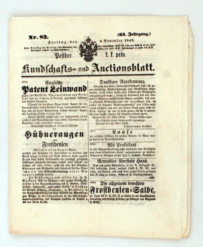 1849 Pesther f.f.priv. Kundschafts- und Auctionsblatt https://www.darabanth.com/hu/267-Gyorsarveres/267.0/Festmeny-mutargy-papirregiseg-egyeb/Nyomtatvanyok~26/1849-Pesther-ffpriv-Kundschafts-und-Auctionsblatt~II1344078