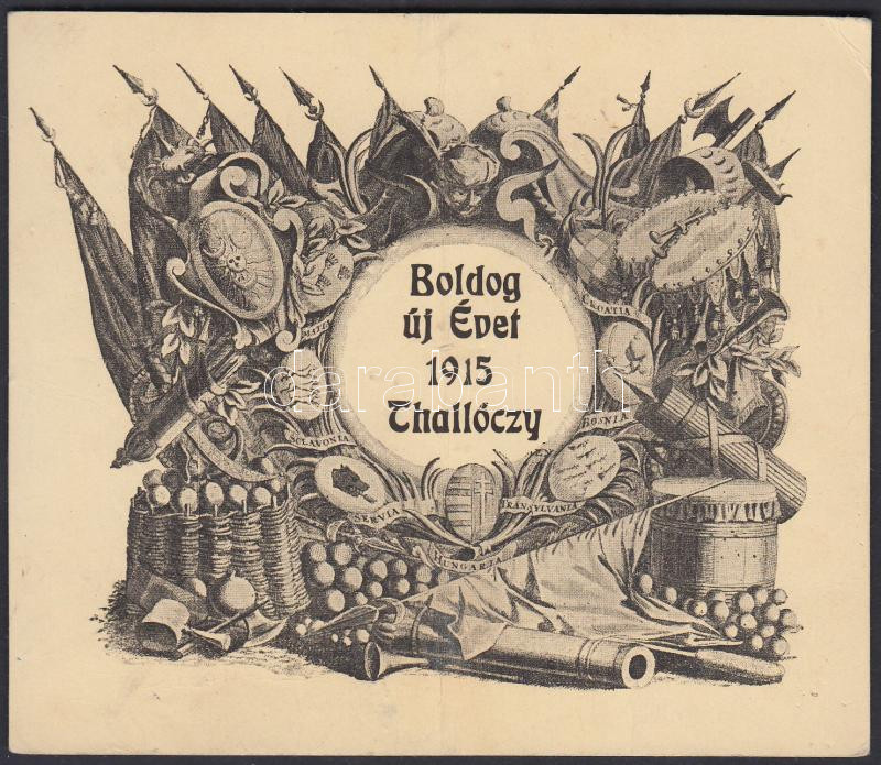 1915 "Boldog új évet kíván Thallóczy"-újévi üdvözlőkártya, hajtott, 11... https://www.darabanth.com/hu/267-Gyorsarveres/267.0/Festmeny-mutargy-papirregiseg-egyeb/Nyomtatvanyok~26/1915-Boldog-uj-evet-kivan-Thalloczy-ujevi-udvozlokartya-hajtott-11x12-cm~II1340538