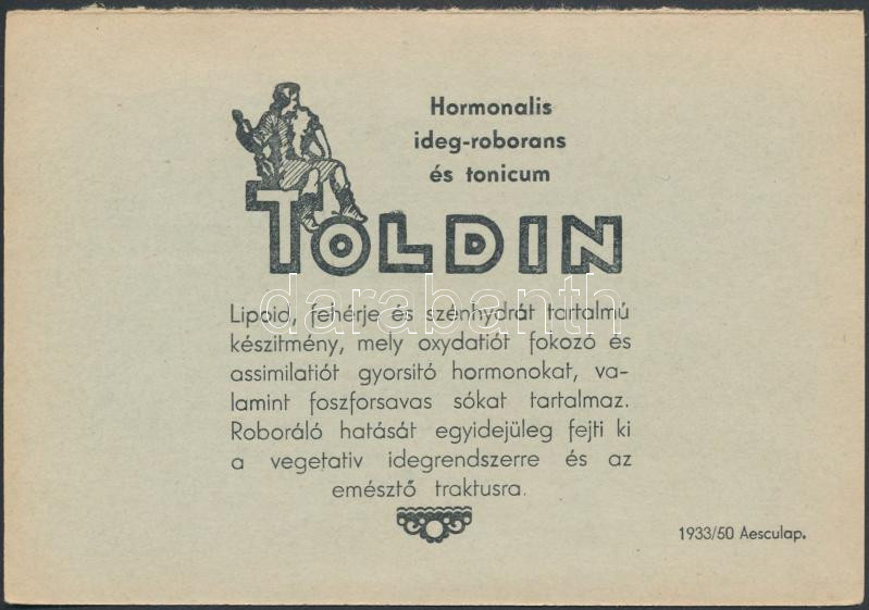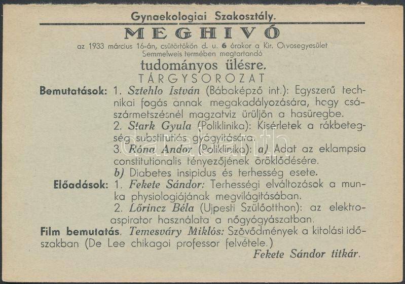 Leírás: 1933 Meghívó tudományos ülésre, Gynaekologiai Szakosztály, verzón gyógyszer reklám, 10x16cm