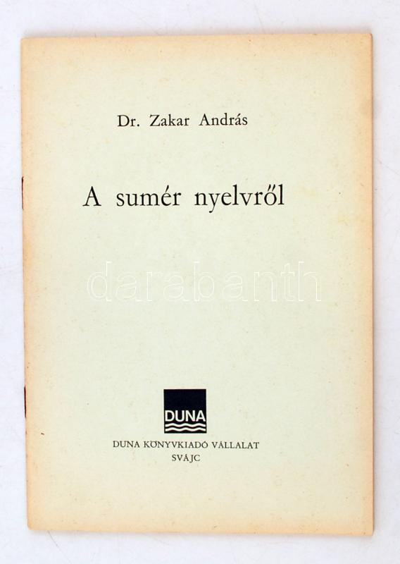 1968 Zakar András dr.: A sumér nyelvről. Duna Könyvkiadó Vállalat, Svá... https://www.darabanth.com/hu/267-Gyorsarveres/267.0/Festmeny-mutargy-papirregiseg-egyeb/Nyomtatvanyok~26/1968-Zakar-Andras-dr-A-sumer-nyelvrol-Duna-Konyvkiado-Vallalat-Svajc-pp55-21x15cm~II1337402