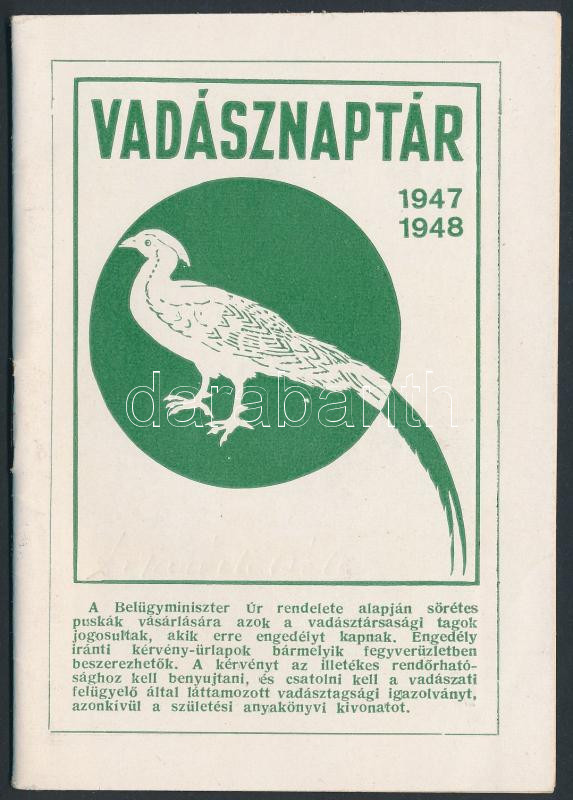 Vadásznaptár 1947-1948 / Ballisztikai adatokkal / Szerkeszti és kiadja... https://www.darabanth.com/hu/267-Gyorsarveres/267.0/Festmeny-mutargy-papirregiseg-egyeb/Nyomtatvanyok~26/Vadasznaptar-1947-1948-Ballisztikai-adatokkal-Szerkeszti-es-kiadja-Ludmanyi-Janos-Budapest~II1338952