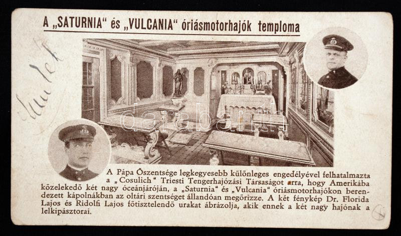 cca 1930-40 A "Saturnia" és "Vulcania" óriásmotorhajók templomainak ny... https://www.darabanth.com/hu/267-Gyorsarveres/267.0/Festmeny-mutargy-papirregiseg-egyeb/Nyomtatvanyok~26/cca-1930-40-A-Saturnia-es-Vulcania-oriasmotorhajok-templomainak-nyomtatvanyai-10x6cm~II1336953