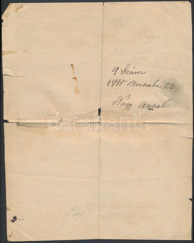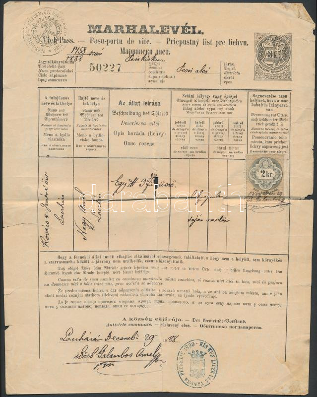 1888 Lacháza, Marhalevél 2+3 kr okmánybélyeggel https://www.darabanth.com/hu/267-Gyorsarveres/267.0/Festmeny-mutargy-papirregiseg-egyeb/Okmanyok~15/1888-Lachaza-Marhalevel-2plus3-kr-okmanybelyeggel~II1341045