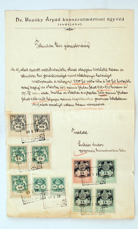 Leírás: 1899 Zálogjog bekebelezési kérelem dr. Bozóky Árpád kunszentmártoni ügyvéd, 11db okmánybélyeggel, 34x21cm