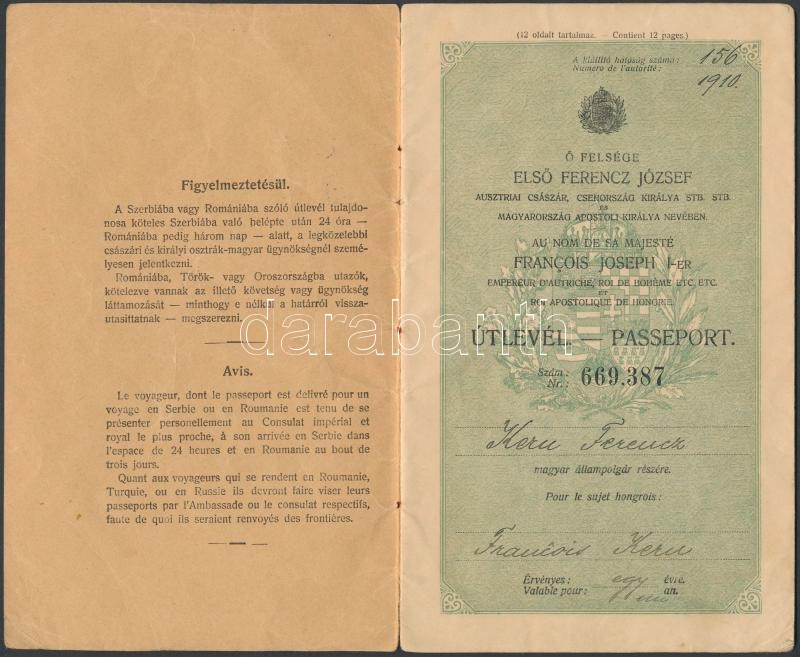 1910 Órás-ékszerész számára kiállított magyar útlevél / Hungarian pass... https://www.darabanth.com/hu/267-Gyorsarveres/267.0/Festmeny-mutargy-papirregiseg-egyeb/Okmanyok~15/1910-Oras-ekszeresz-szamara-kiallitott-magyar-utlevel-Hungarian-passport~II1342059