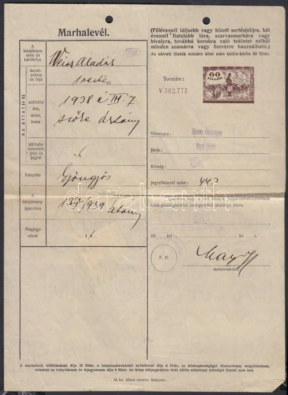 1939 Kál, Marhalevél vízjeles papíron, okmánybélyeggel https://www.darabanth.com/hu/267-Gyorsarveres/267.0/Festmeny-mutargy-papirregiseg-egyeb/Okmanyok~15/1939-Kal-Marhalevel-vizjeles-papiron-okmanybelyeggel~II1338410