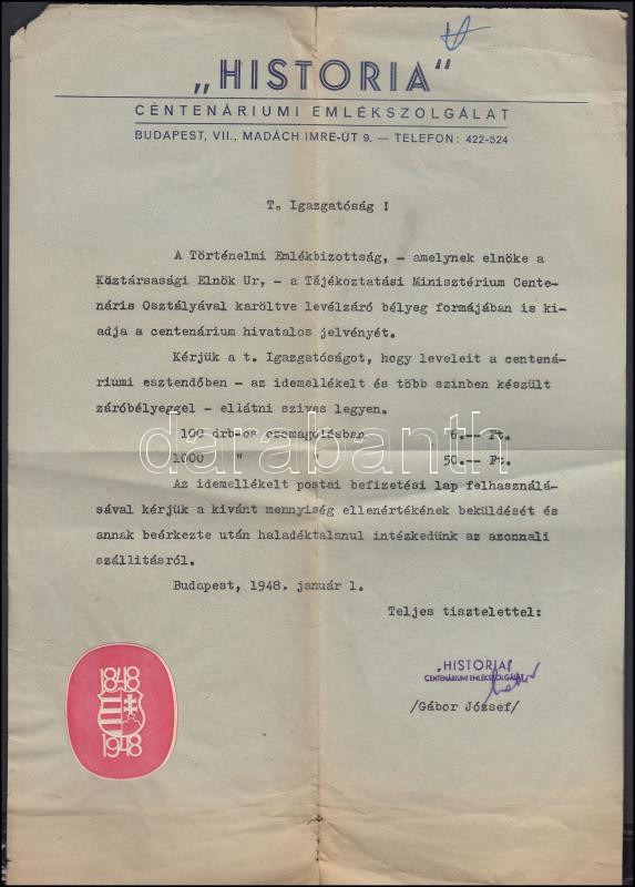1948 Galamb József (?-?) bélyegtervező (?) gépelt levele az 1848-49-es szabadságharc centenáriumi emlék levélzáró kiadásáról és terjesztéséről, a História Centenáriumi Emlékbizottság fejléces papírján, rányomott levélzáróval