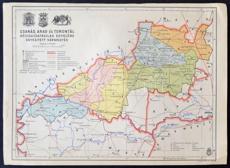 1941 Csanád, Arad és Torontál közigazgatásilag egyelőre egyesített vár... https://www.darabanth.com/hu/267-Gyorsarveres/267.0/Festmeny-mutargy-papirregiseg-egyeb/Terkepek~25/1941-Csanad-Arad-es-Torontal-kozigazgatasilag-egyelore-egyesitett-varmegyek-terkepe-kia~II1338248