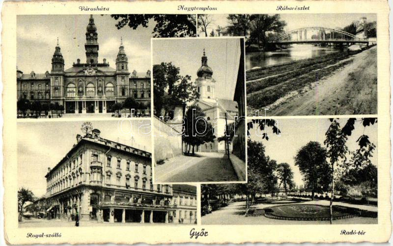 Győr, Városháza, Rábarészlet, Royal-szálló, Radó-tér, Nagytemplom (EK) https://www.darabanth.com/hu/267-Gyorsarveres/267.0/Kepeslapok/Magyarorszag~300005/Gyor-Varoshaza-Rabareszlet-Royal-szallo-Rado-ter-Nagytemplom-EK~II1336503