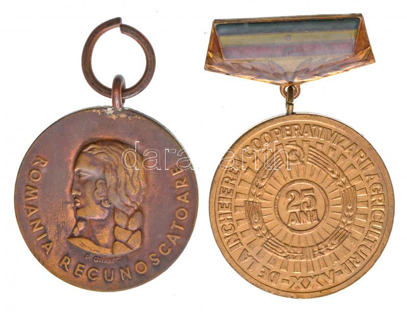 Románia 1941. "Kommunizmus Elleni Keresztes hadjárat" fém kitüntetés mellszalag nélkül. Szign.: P. GRANT. + 1987. "A mezőgazdasági kollektivizálás befejeződésének 25. évfordulójára" Br kitüntetés T:2,2- javított fül