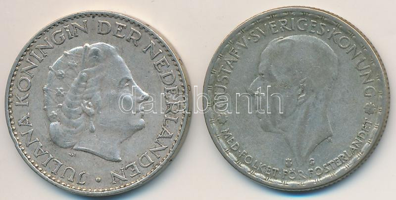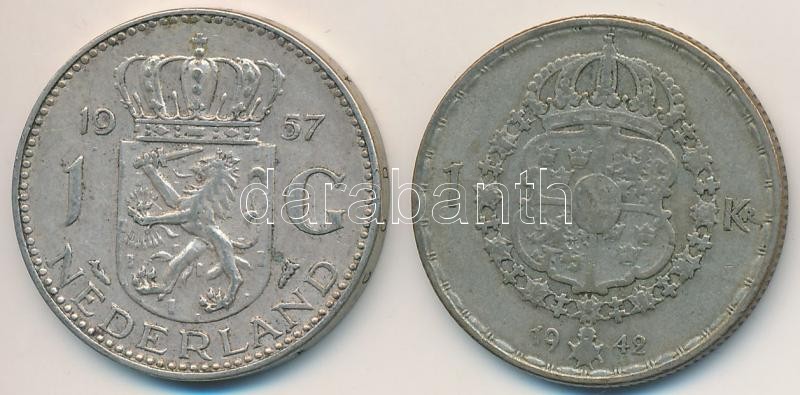 Leírás: Vegyes: Hollandia 1957. 1G Ag "Julianna" + Svédország 1942. 1K Ag "V. Gusztáv" T:2,2-