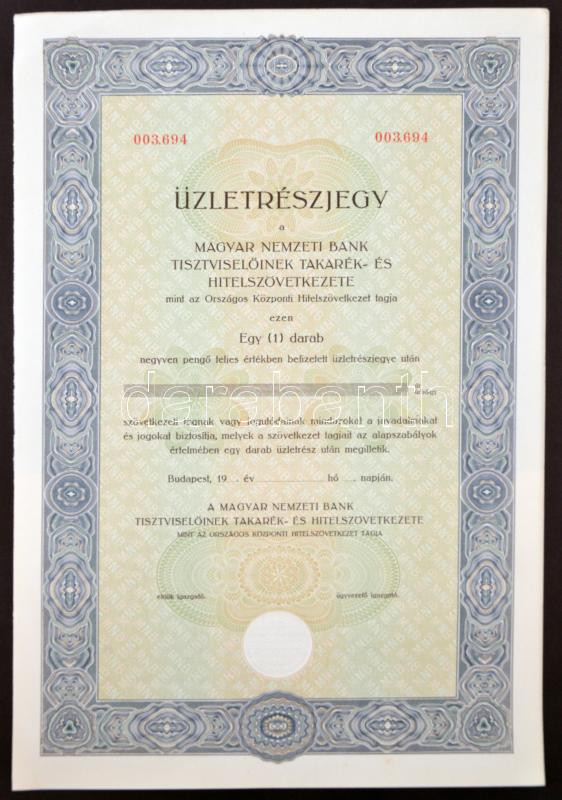 ~1940. "Magyar Nemzeti Bank Tisztviselőinek Takarék- és Hitelszövetkez... https://www.darabanth.com/hu/267-Gyorsarveres/267.0/Numizmatika/Reszvenyek-es-sorsjegyek~400005/7E1940-Magyar-Nemzeti-Bank-Tisztviseloinek-Takarek-es-Hitelszovetkezete-kitoltetlen-uzletrC3~II1342004