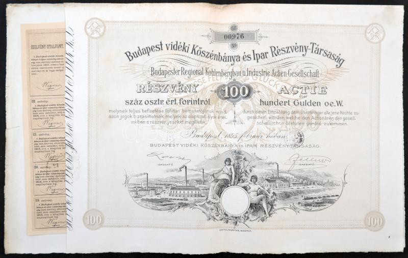 Budapest 1895. "Budapest vidéki Kőszénbánya és Ipar Részvény-Társaság" részvénye 100Ft-ról szelvényekkel, bélyeggel, bélyegzésekkel T:II-,III kis ly., szakadás