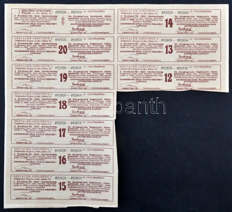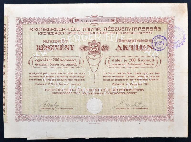Leírás: Budapest 1921. "Kronberger-féle Faipar Részvénytársaság" 25 részvénye egyben, egyenként 200K-ról szelvényekkel, bélyegzésekkel T:I-,II
