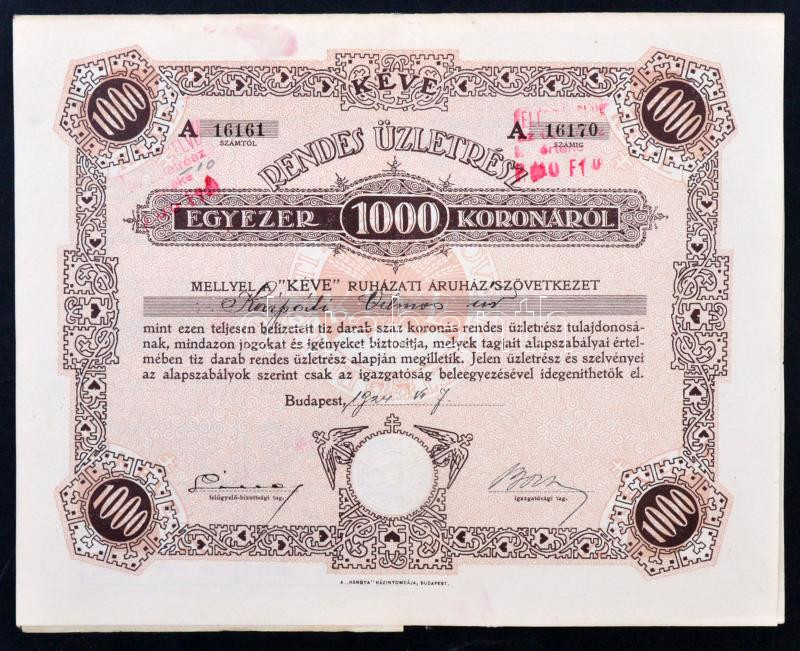Budapest 1924. " 'Kéve' Ruházati Áruház Szövetkezet" rendes üzletrésze... https://www.darabanth.com/hu/267-Gyorsarveres/267.0/Numizmatika/Reszvenyek-es-sorsjegyek~400005/Budapest-1924-Keve-Ruhazati-Aruhaz-Szovetkezet-rendes-uzletresze-1000K-rol-szarazpec~II1336536