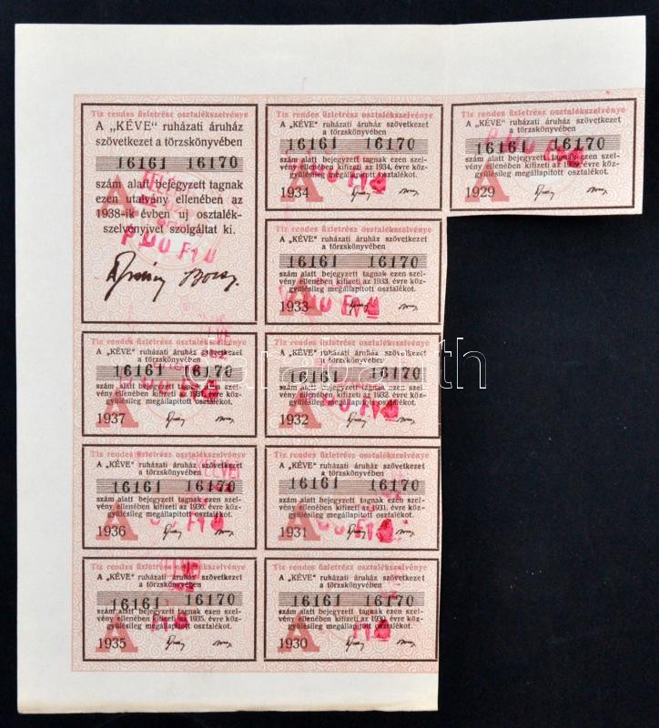 Leírás: Budapest 1924. " 'Kéve' Ruházati Áruház Szövetkezet" rendes üzletrésze 1000K-ról, szárazpecséttel, szelvényekkel, bélyegzésekkel T:II-