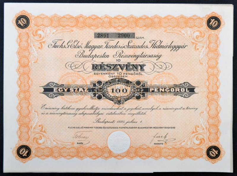 Budapest 1925. "Fuchs G. Első Magyar Tizedes és Százados Hídmérleggyár... https://www.darabanth.com/hu/267-Gyorsarveres/267.0/Numizmatika/Reszvenyek-es-sorsjegyek~400005/Budapest-1925-Fuchs-G-Elso-Magyar-Tizedes-es-Szazados-Hidmerleggyar-reszvenye-100P-rol-~II1338470