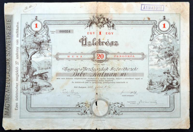 Budapest 1935. "Magyar Mezőgazdák Szövetkezete" üzletrésze 20P-ről fel... https://www.darabanth.com/hu/267-Gyorsarveres/267.0/Numizmatika/Reszvenyek-es-sorsjegyek~400005/Budapest-1935-Magyar-Mezogazdak-Szovetkezete-uzletresze-20P-rol-felulbelyegzesekkel-sze~II1339841