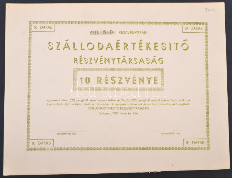 Leírás: Budapest 1937. "Szállodaértékesítő Részvénytársaság" részvénye 500P-ről, kitöltetlen T:I,I-