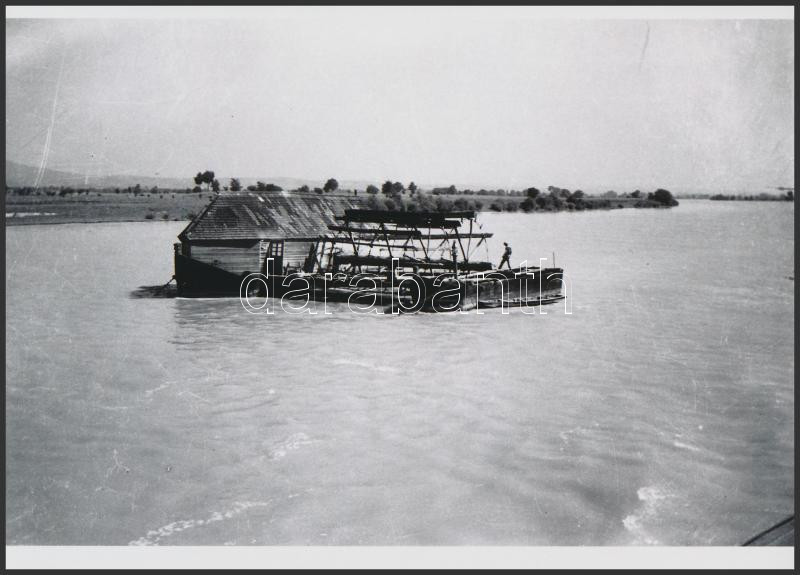 Leírás: cca 1930 Úszó vízimalom a Dunán, Kerny István (1879-1963) hagyatékában őrzött üveglemez negatívról készült modern nagyítás, 13x18 cm