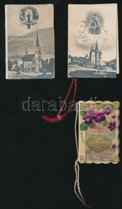 Leírás: cca 1930-40 Kegyhelyes, kinyithatós szentképek, 3db, különböző méretben, cca 5x3cm és 6x4cm között