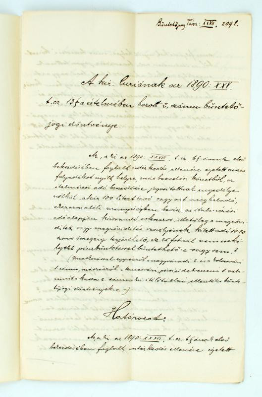 Leírás: 1890 Büntetőjogi döntvény égettet szesszel kapcsolatos témában, pp.:6, 34x21cm