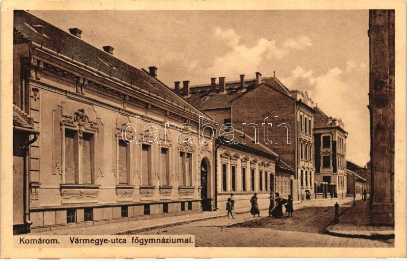 Komárom, Komárno; Vármegye utca, főgimnázium / street, grammar school https://www.darabanth.com/hu/268-Gyorsarveres/268.0/Kepeslapok/Felvidek~200007/Komarom-Komarno-Varmegye-utca-fogimnazium-street-grammar-school~II1345025