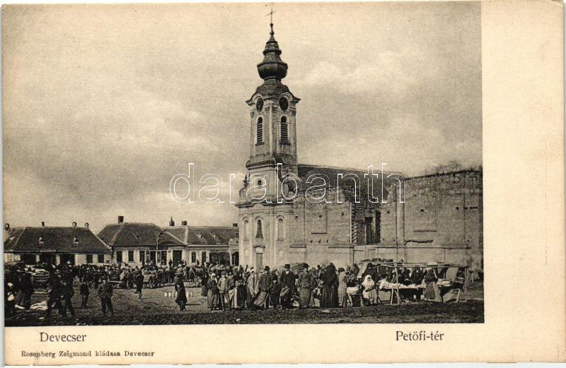 Devecser, Petőfi tér, piac, templom rom, kiadja Rosenberg Zsigmond https://www.darabanth.com/hu/268-Gyorsarveres/268.0/Kepeslapok/Magyarorszag~200005/Devecser-Petofi-ter-piac-templom-rom-kiadja-Rosenberg-Zsigmond~II1347734