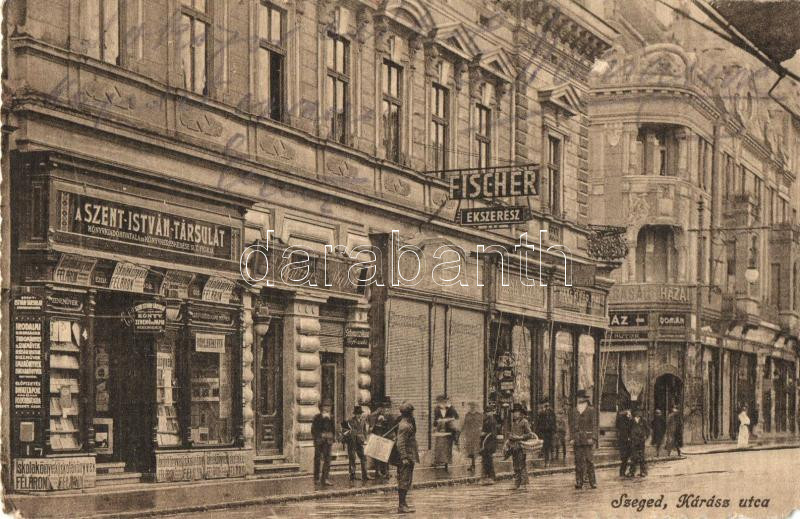 Leírás: Szeged, Kárász utca, a Szent István Társulat üzlete, Fischer ékszerész; kiadja a Szent István Társulat (EK)