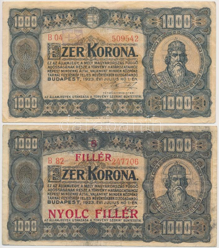 1923. 1000K "8 FILLÉR - NYOLC FILLÉR" felülnyomással + 1923.... https://www.darabanth.com/hu/268-Gyorsarveres/268.0/Numizmatika/Magyar-bankjegyek~300006/1923-1000K-8-FILLER--NYOLC-FILLER-felulnyomassal-plus-1923-1000K-Magyar-Penzjegynyomda-Rt-B~II1345793