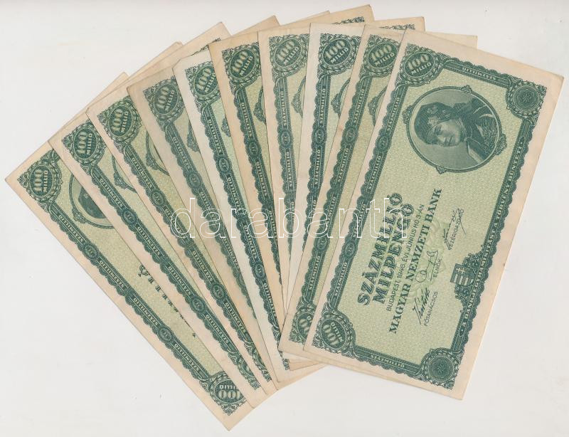 1946. 100.000.000MP (30x) T:III,III- https://www.darabanth.com/hu/268-Gyorsarveres/268.0/Numizmatika/Magyar-bankjegyek~300006/1946-100000000MP-30x-TIII-III-~II1351283