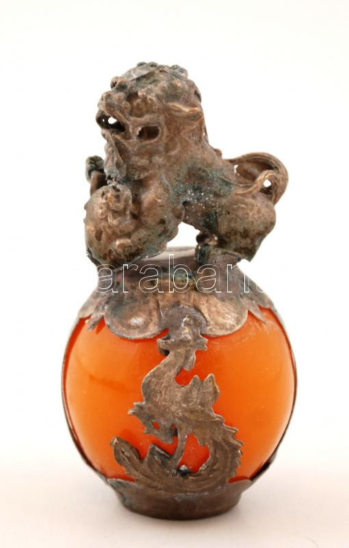 Leírás: Nagyméretű féldrágakő oroszlános fém foglalatban, m: 6 cm