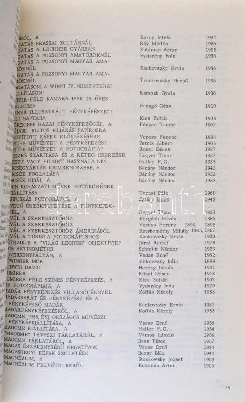Szilágyi Gábor: A magyar fotóművészek szakírói tevékenységének repertóriuma (1882-1978). (Bp., 1979); A magyar fotográfia tisztségviselői (1872-1945). (Bp., 1977). A két kiadvány egybekötve (Bp., 1981). Papírkötésben, jó állapotban.