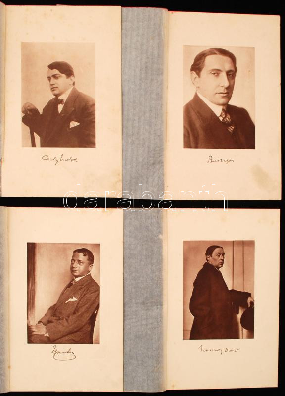 11 db. fotónyomat nyomdai aláírással. Költők, írók, drámaírók fényképei. Köztük több Nyugatos szerző is van. (Ady Endre, Bíró Lajos,Szomory Dezső,Ignotus,Molnár Ferenc, Móricz Zsigmond, Lengyel Menyhért, Miklós Jenő, Krúdy Gyula, Csáth Géza, Heltai Jenő.) A képek védőpapírjai néhol foltosak, de többségében jó állapotban vannak.