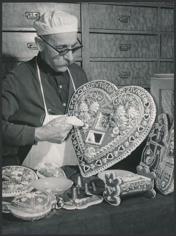 Leírás: cca 1967 Debreceni mézeskalácsos mester díszíti a Szívtől szívnek Debrecenből feliratú mézeskalács szívet, vintage fotó, 12x9 cm