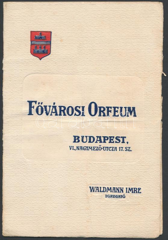 1911 Bp., A Fővárosi Orfeum műsorfüzete, sok reklámmal(Törley, Kohn He... https://www.darabanth.com/hu/269-Gyorsarveres/269.0/Festmeny-mutargy-papirregiseg-egyeb/Nyomtatvanyok~30/1911-Bp-A-Fovarosi-Orfeum-musorfuzete-sok-reklammalTorley-Kohn-Heilmann-es-Fiai-Bristol~II1355661