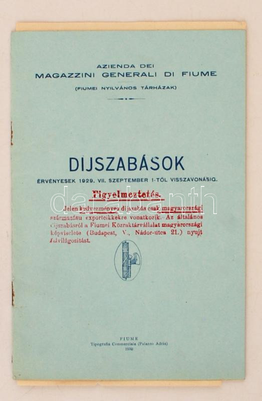 1929 Díjszabások Azienda dei Magazzini generali di Fiume (Fiumei nyilv... https://www.darabanth.com/hu/269-Gyorsarveres/269.0/Festmeny-mutargy-papirregiseg-egyeb/Nyomtatvanyok~30/1929-Dijszabasok-Azienda-dei-Magazzini-generali-di-Fiume-Fiumei-nyilvanos-tarhazak-pp26-2~II1356029