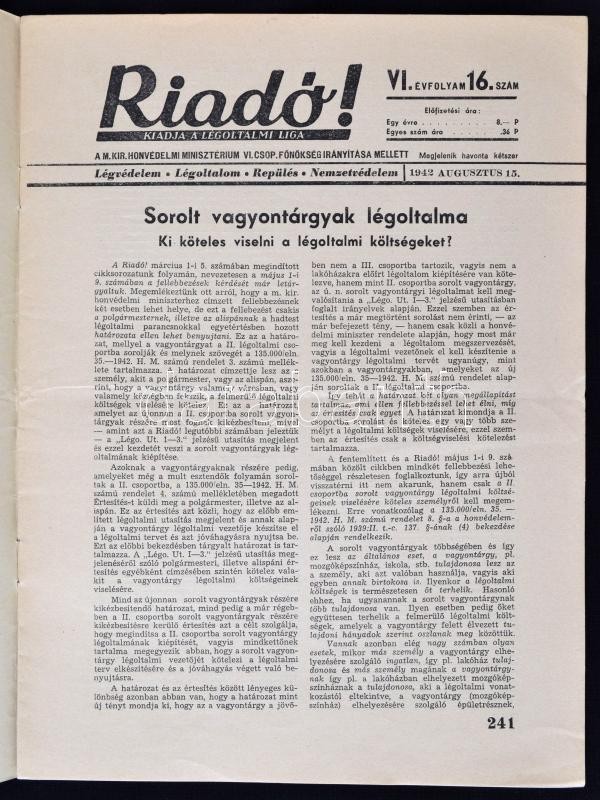 1942 Riadó! A Légoltalmi Liga Lapja VI. évfolyamának 16. száma https://www.darabanth.com/hu/269-Gyorsarveres/269.0/Festmeny-mutargy-papirregiseg-egyeb/Nyomtatvanyok~30/1942-Riado-A-Legoltalmi-Liga-Lapja-VI-evfolyamanak-16-szama~II1355342