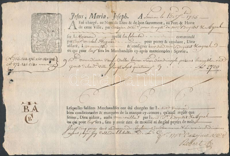 1755 Francia nyelvű szerződés(?) kereskedelmi ügyekben https://www.darabanth.com/hu/269-Gyorsarveres/269.0/Festmeny-mutargy-papirregiseg-egyeb/Okmanyok~19/1755-Francia-nyelvu-szerzodes-kereskedelmi-ugyekben~II1353140