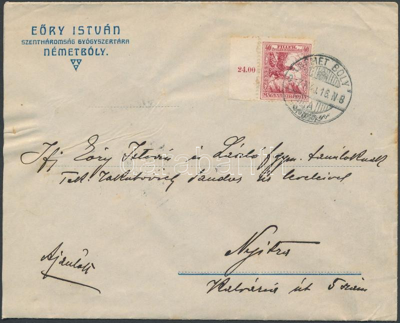 Leírás: 1917 A németbólyi Eőry István Szentháromság Gyógyszertára fejléces borítéka