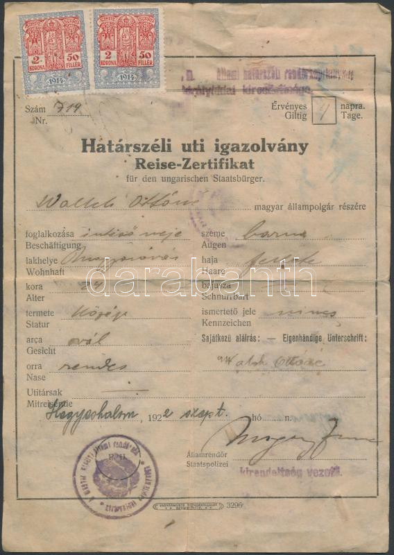 Leírás: 1922 Határszéli uti igazolvány, Hegyeshalom, okmánybélyeggel (2,5 korona), 22x15cm