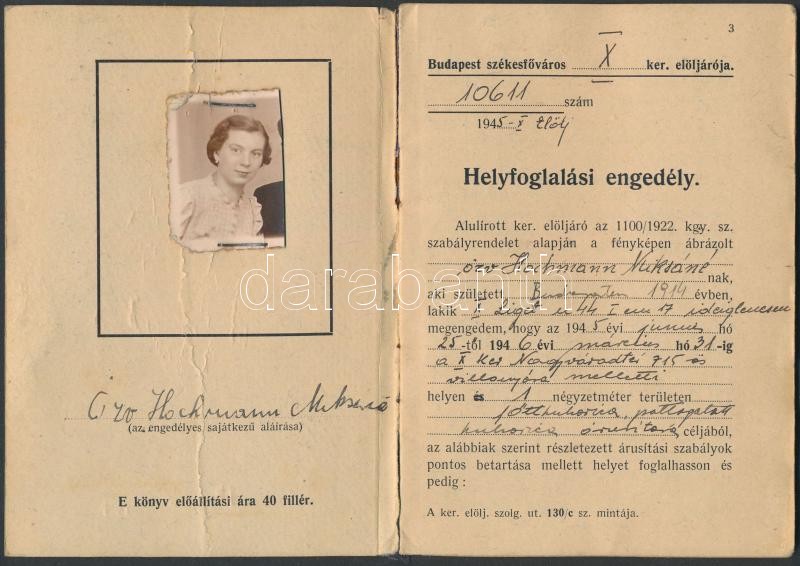 1945 Helyfoglalási engedély, Budapest X. ker. elöljárója, pp.:12, 15x1... https://www.darabanth.com/hu/269-Gyorsarveres/269.0/Festmeny-mutargy-papirregiseg-egyeb/Okmanyok~19/1945-Helyfoglalasi-engedely-Budapest-X-ker-eloljaroja-pp12-15x10cm~II1355421