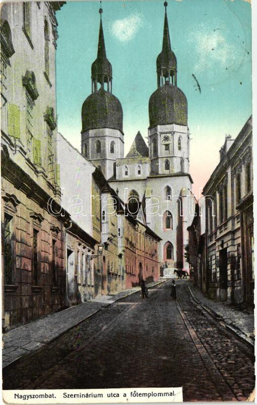 Leírás: Nagyszombat, Trnava; Szeminárium utca, főtemplom / street, church (EB)