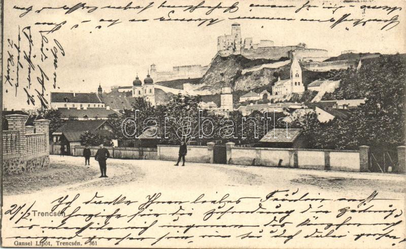 Leírás: Trencsén, Trencin; utca, vár / street, castle (vágott / cut)