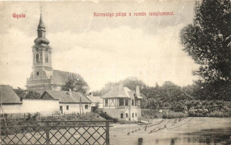 Leírás: Gyula, Korcsolya pálya a román templommal (fa)