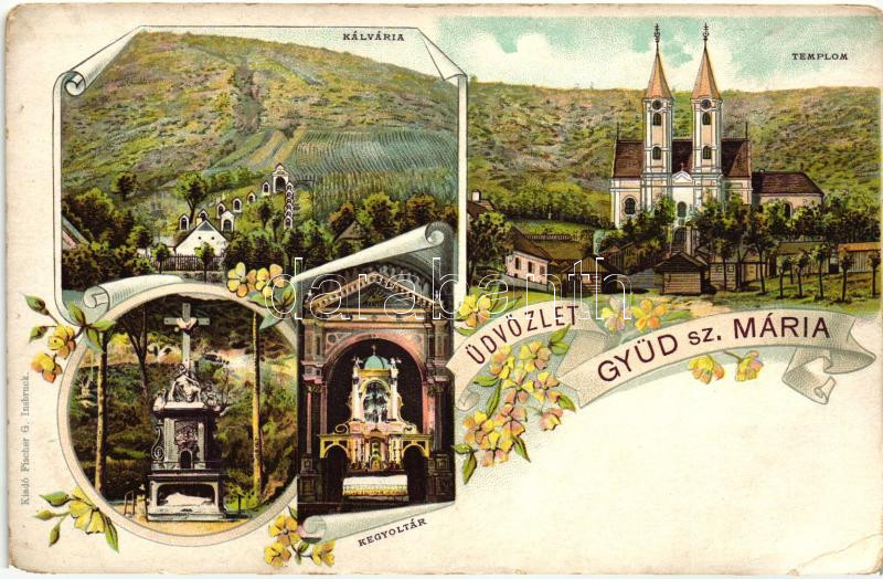 Leírás: Máriagyüd, Kálvária, Templom, Kegyoltár, floral litho (EK)