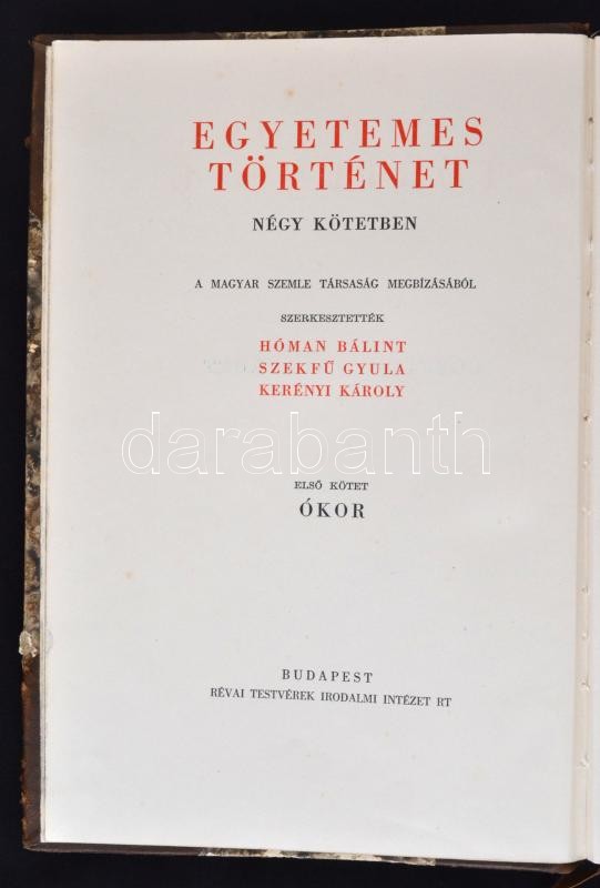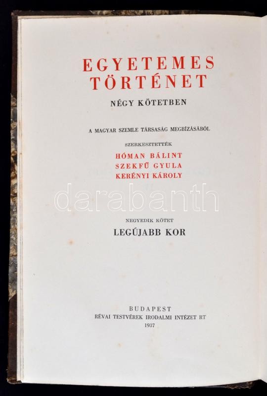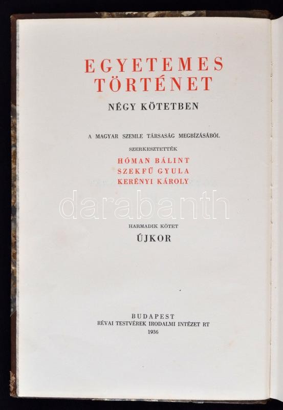 Hóman Bálint-Szekfű Gyula-Kerényi Károly (szerk.): Egyetemes Történet I,III, IV. Budapest, 1937, Révai Testvérek Irodalmi Intézet Rt. - Magyar Szemle Társaság. Kopottas félbőr kötés, márványozott lapélekkel, 704+676+660 p.