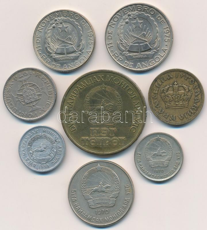 Mixed: Angola 1974. 2 1/2 Escudos Cu-Ni + 1977. 2 Kwanzas Cu-Ni + 5 Kwanzas Cu-Ni + Yugoslavia 1938. 1 Dinar Al-Br + Mongolia 1959. 10 Mongo Al + 1970. 10 Mongo Cu-Ni + 20 Mongo Cu-Ni + 1971. 1 Tugrik "50th Anniversary of the Revolution" C:XF,VF