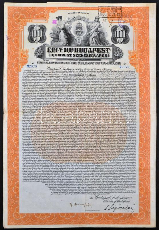 Amerikai Egyesült Államok / New York / Magyarország 1927. "Budapest Székesfőváros" 6%-kal kamatozó arany kötvény 1000$-ról szelvényekkel, bélyegzésekkel T:III USA / New York / Hungary 1927. "City of Budapest" 6% gold bond about 1000 Dollars with coupons and stamps C:F